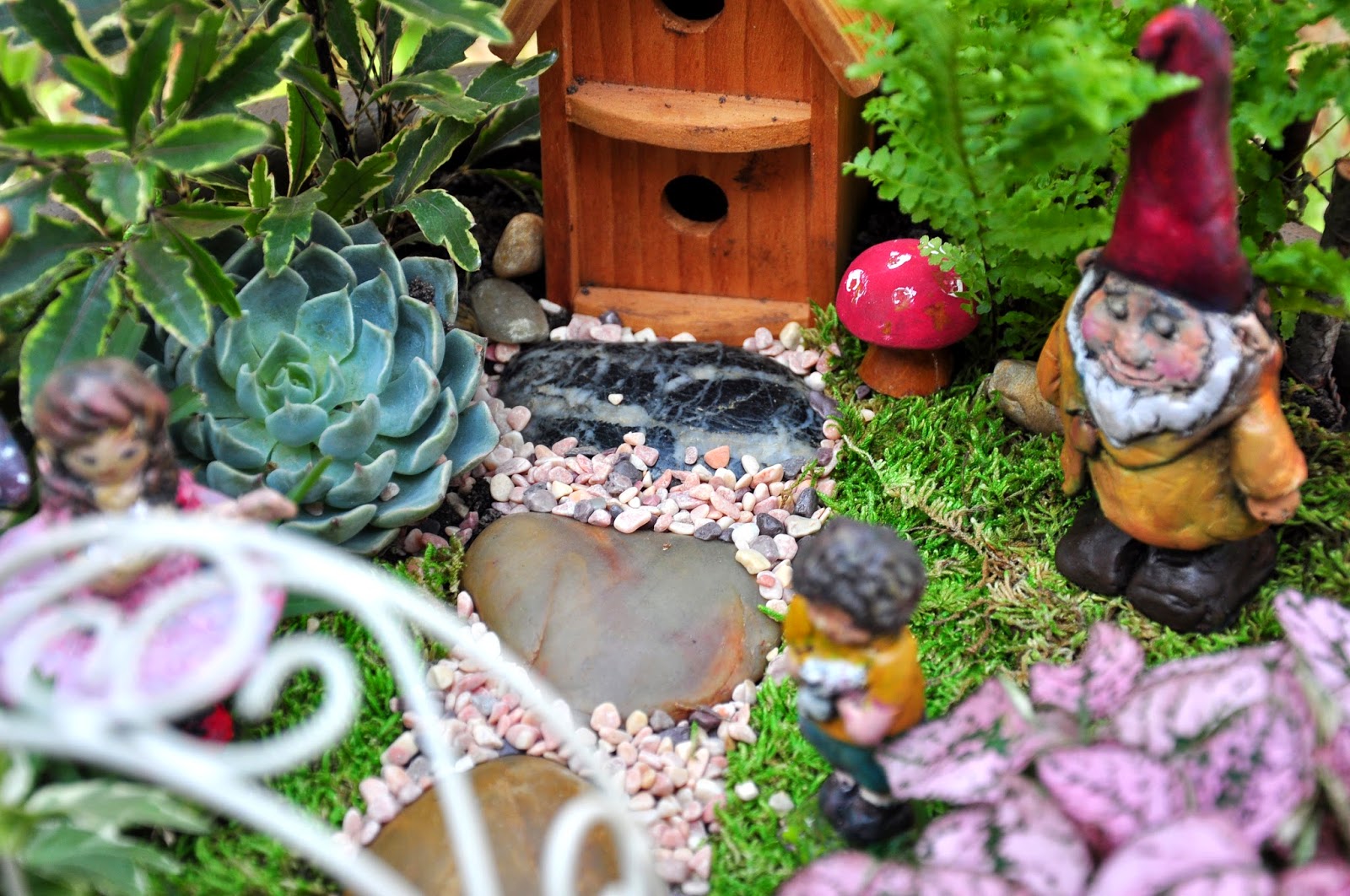Welcome to our fairy garden. We love that the sculptures of the characters were made by mom.